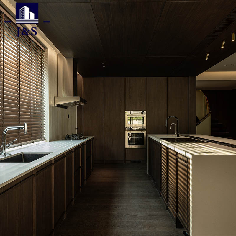 We are Modern Kitchen Cabinet Maker in China supply this modern kitchen features a sleek dark wood cabinetry system, creating a warm, sophisticated atmosphere with seamless, handleless storage. The dual quartz countertops maximize workspace, while natural light from wooden blinds adds a cozy, inviting glow. Integrated high-end appliances and a functional island enhance both style and practicality, blending minimalist luxury with everyday usability.
